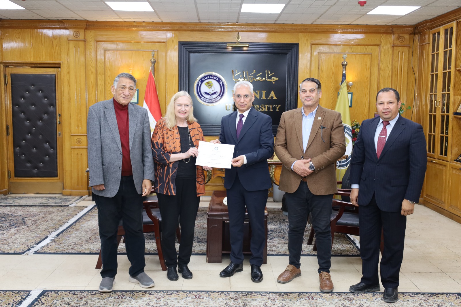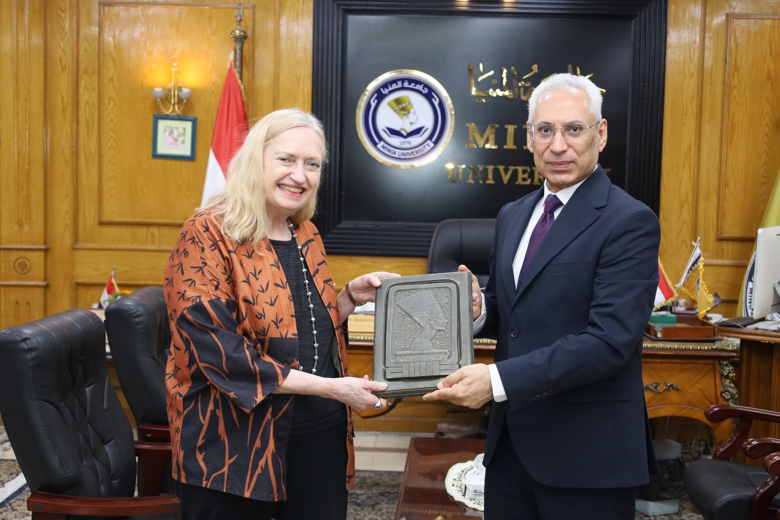 وفي ختام اللقاء، أهدى رئيس الجامعة الدكتورة ريجينا شولتز لوحة جدارية تجسد رأس نفرتيتي، شعار جامعة المنيا والمحافظة، تعبيرًا عن التقدير والاعتزاز بالتعاون الأكاديمي، ورمزًا يعكس العمق الحضاري والتاريخي لمحافظة المنيا ومكانتها على خريطة التراث العالمي.