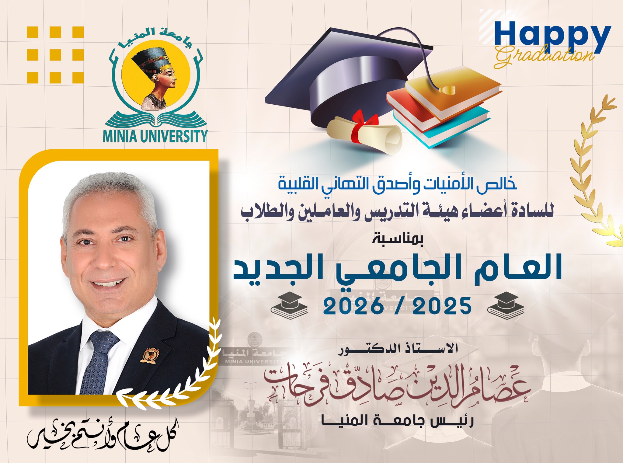 خالص الأمنيات وأصدق التهاني القلبية لجميع منتسبي جامعة المنيا بمناسبة بدء العام الجامعي الجديد، متمنياً للجميع عامًا دراسيًا موفقًا مليئًا بالجد والاجتهاد والنجاح. أ.د/ عصام الدين صادق فرحات رئيس جامعة المنيا