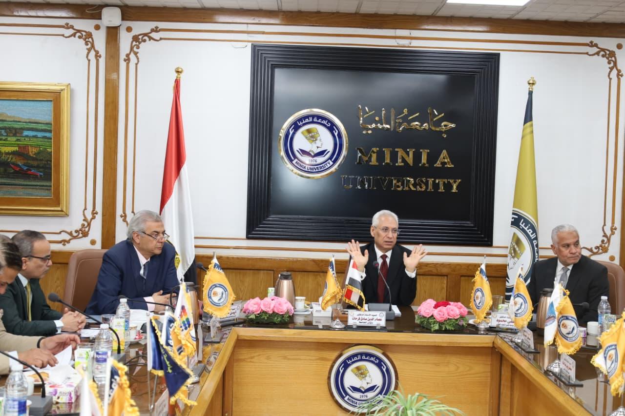 رئيس جامعة المنيا خلال ترأسه الاجتماع الدوري لمجلس الجامعة: - استعدادات مكثفة لإطلاق “ملتقى الحضارات على أرض الحضارات.. عروس الصعيد” في اليوبيل الذهبي للجامعة وبالتعاون مع محافظة المنيا - اعتماد خطة شاملة لترشيد الطاقة وتعزيز الاستدامة داخل الحرم الجامعي وتشكيل لجنة عليا للترشيد .. ودراسة تقديم تجارب نموذجية باستخدام الطاقة الجديدة والمتجددة للتعميم داخل الجامعة والمجتمع - إطلاق مسابقة طلابية وجوائز تحفيزية لدعم الابتكار في مجال الطاقة وتفعيل دور “الطلاب أصدقاء البيئة” لنشر ثقافة الاستدامة داخل الكليات - آليات مراجعة مركزية لمواصفات الورقة الامتحانية لاختبارات الفصل الدراسي الأول والمجلس يتخذ عدد من الإجراءات التصحيحية ويؤكد على أن التطوير يبدأ من التقييم - إطلاق جائزة جامعة المنيا لأفضل رائد ورائدة أعمال من الطلاب والخريجين خلال ثلاث سنوات - رئيس الجامعة يكرّم عميد طب الأسنان السابق ويهنئ القيادات الجديدة - تعزيز التعاون الدولي وتوسيع الشراكات مع الجامعات العالمية المرموقة - ربط البرامج الدراسية باحتياجات سوق العمل في ضوء التوجيهات الرئاسية - مركز الجودة والاعتماد يستعرض نتائج زيارات المحاكاة والاستعداد لزيارات الهيئة - تحديث منظومة إدخال البيانات الثبوتية وتدريب الكوادر على الإدارة الرقمية الحديثة