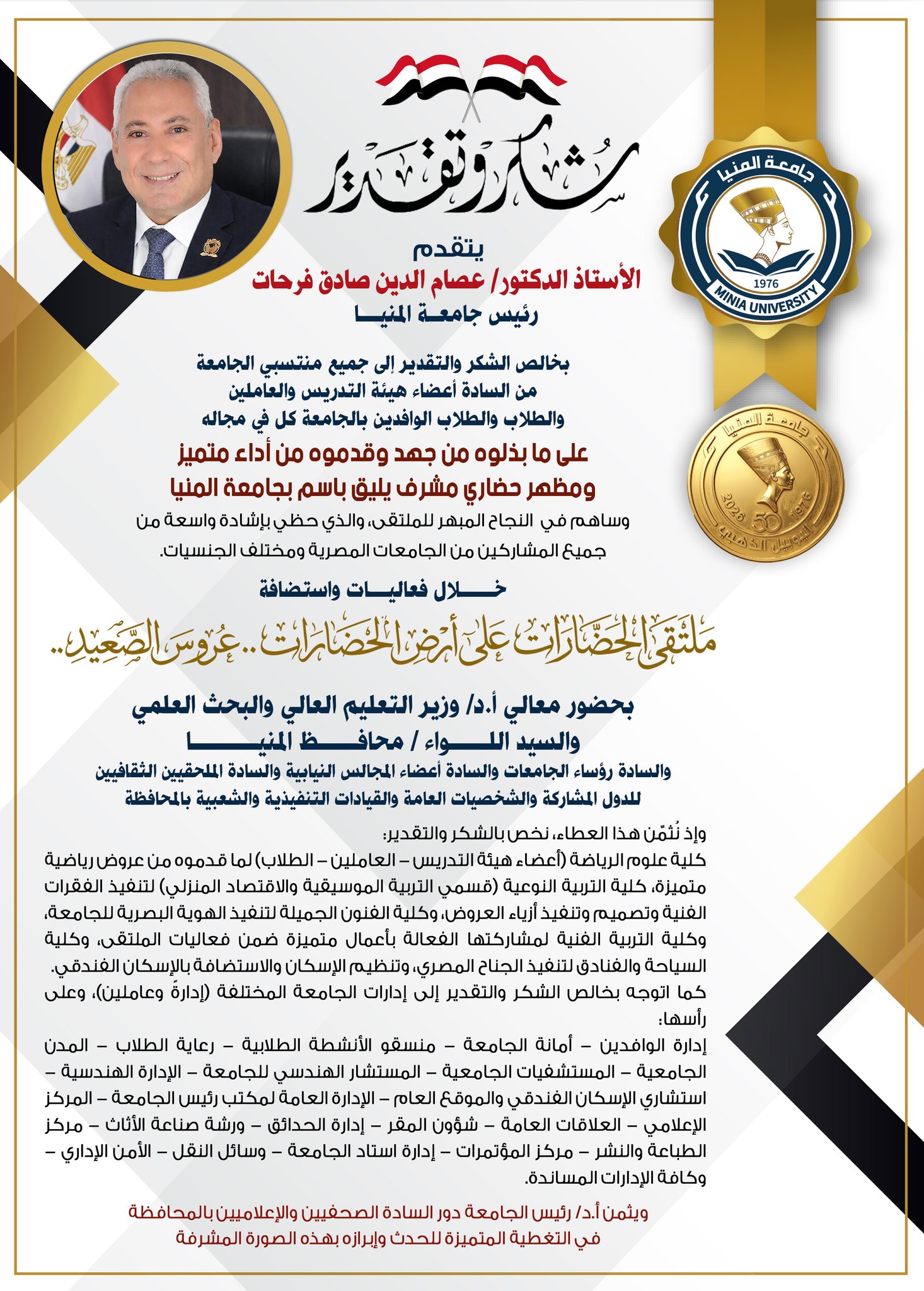ختام فعاليات "ملتقى الحضارات" بجامعة المنيا، في ضوء الاحتفال باليوبيل الذهبي للجامعة في الفترة من (٥ - ٧) ابريل ٢٠٢٦م. ========================================