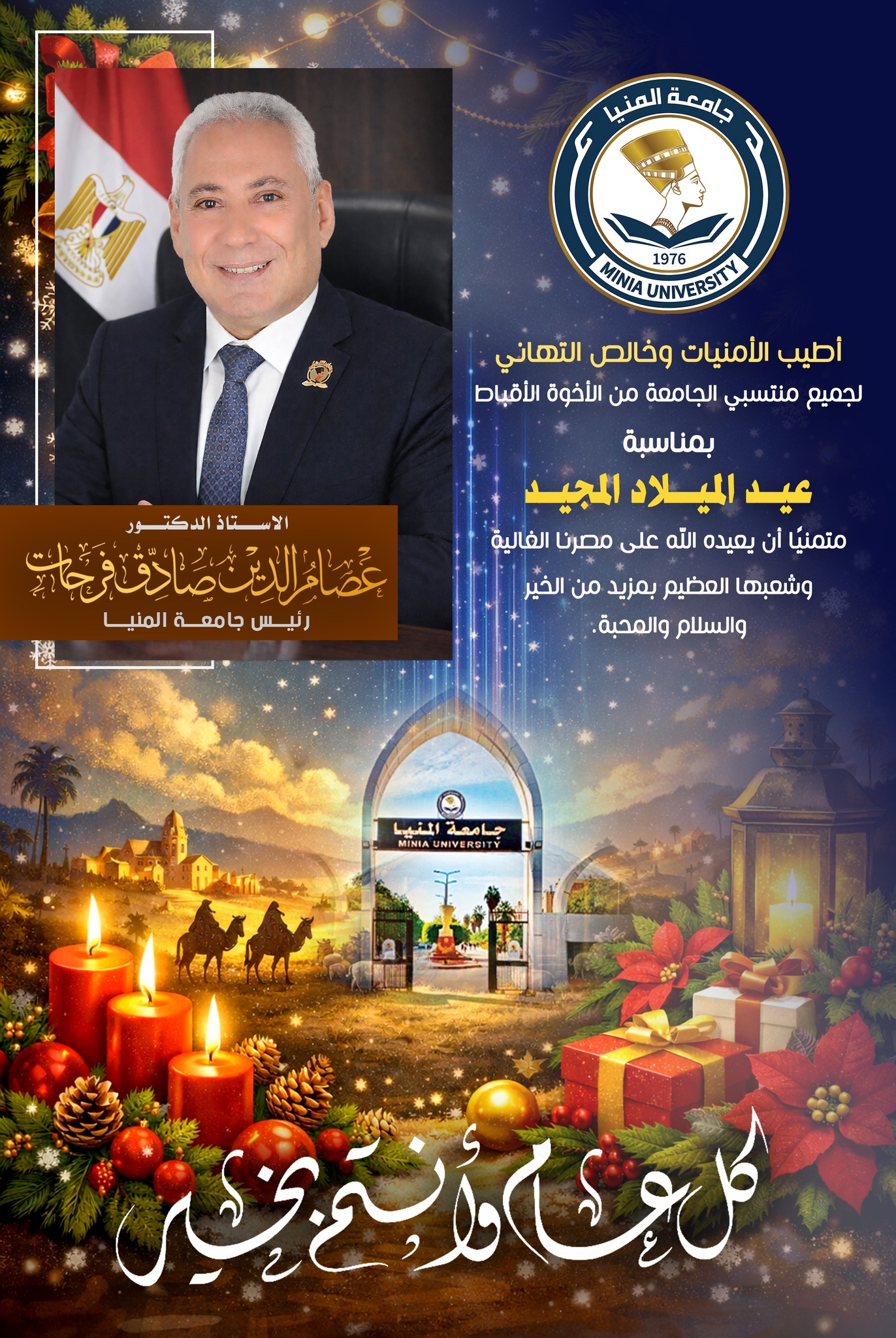 أطيب الأمنيات وخالص التهاني لجميع منتسبي الجامعة من الأخوة الأقباط بمناسبة عيــد الميـــلاد المجيــد متمنيًا أن يعيده الله على مصرنا الغالية وشعبها العظيم بمزيد من الخير والسلام والمحبة. أ.د/ عصام الدين صادق فرحات رئيس جامعة المنيا