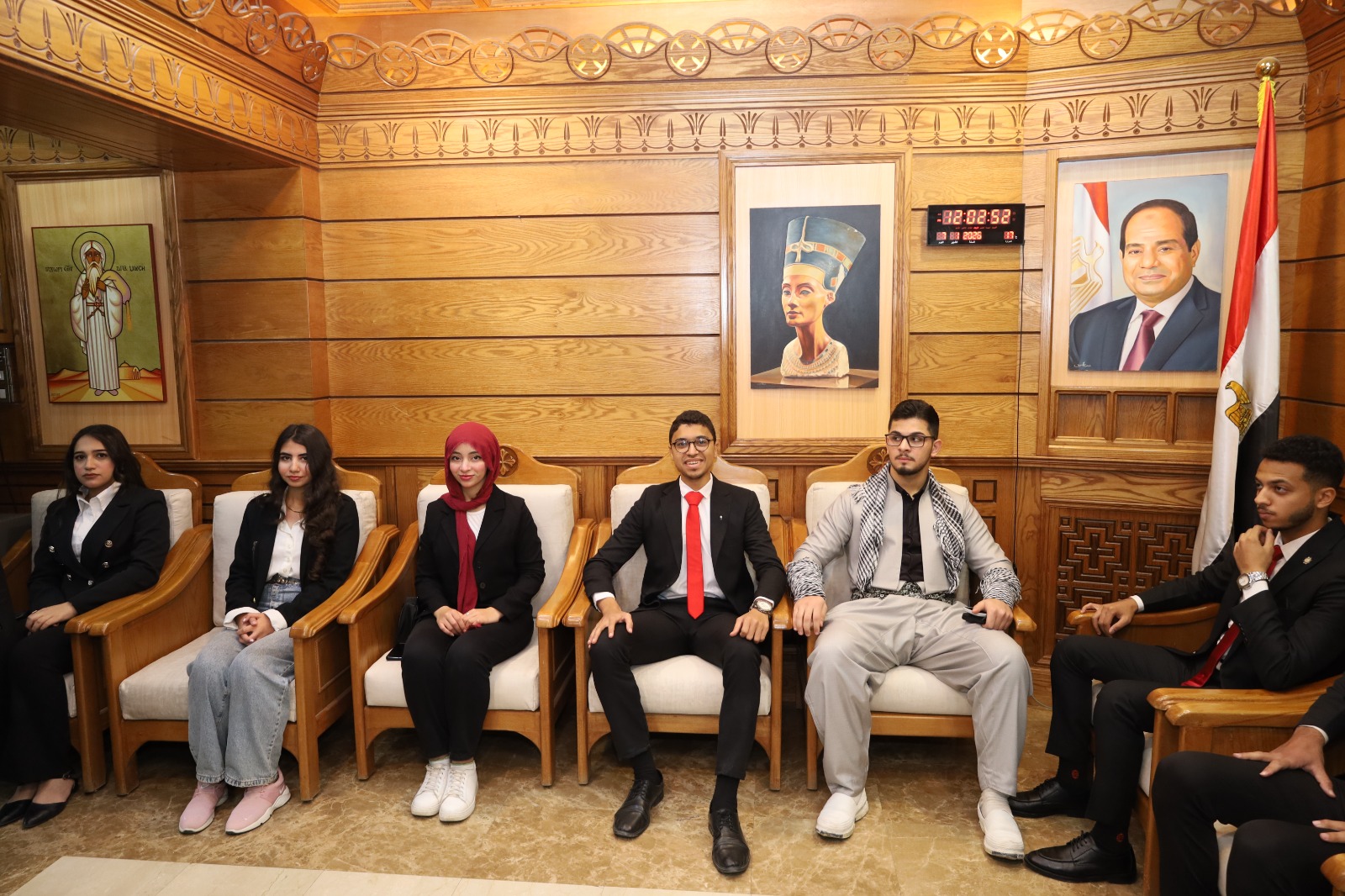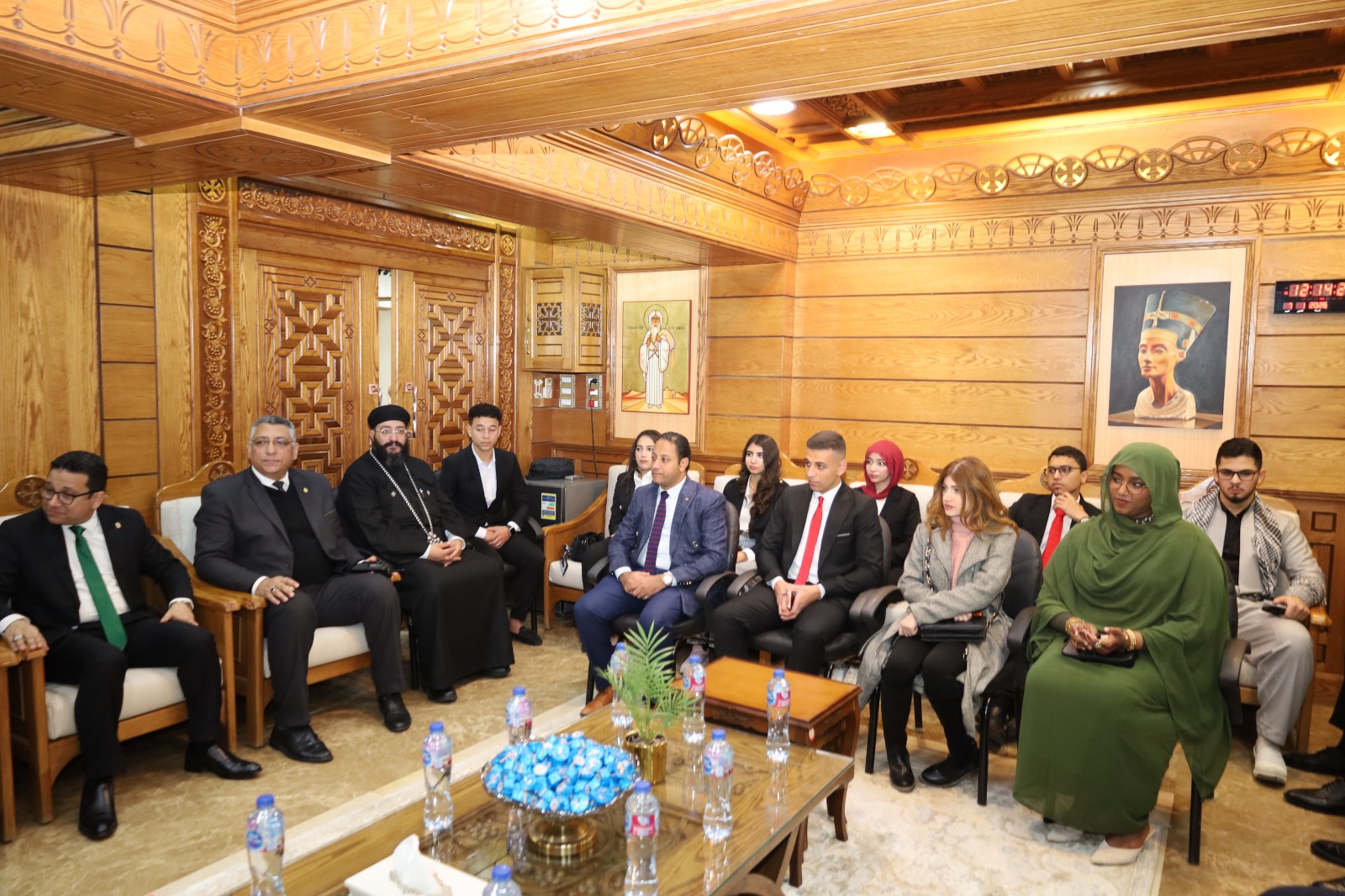 ورافق رئيس الجامعة خلال الزيارة وفدٌ من الجامعة ضم نواب رئيس الجامعة، الدكتور أيمن حسنين، نائب رئيس الجامعة لشئون خدمة المجتمع وتنمية البيئة، والدكتور مصطفي محمود نائب ريس الجامعة لشئون التعليم والطلاب، والدكتور حسام شوقي، نائب رئيس الجامعة لشئون الدراسات العليا والبحوث، وعددًا من القيادات الجامعية، إلى جانب طلاب الجامعة وممثلين عن الطلاب الوافدين، في تأكيد واضح على الدور التربوي والوطني الذي تضطلع به الجامعة في غرس قيم التعايش وقبول الآخر بين شبابها.