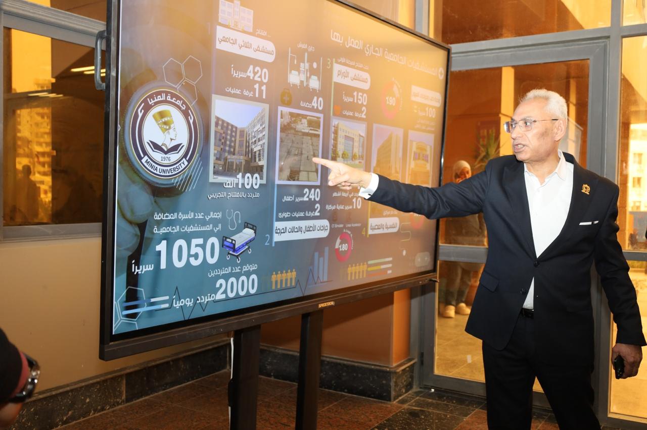 على هامش زيارة رئيس مجلس الوزراء لجامعة المنيا واحتفالاً بيوبيلها الذهبي: وزير التعليم العالي يتفقد مستشفى الاورام وفندق الجامعة والمبنى الفندقي الثاني الجاري الانتهاء منه لافتتاحهم قريباً